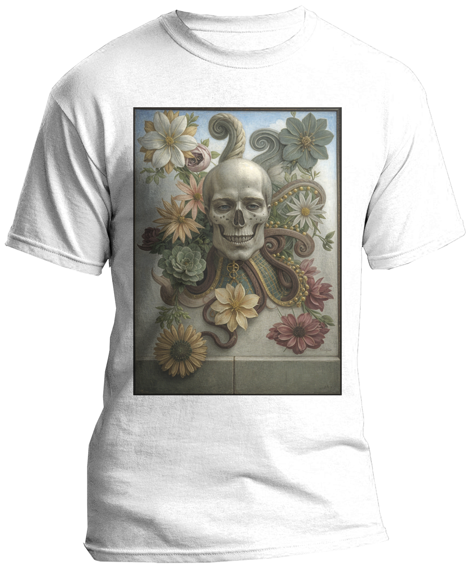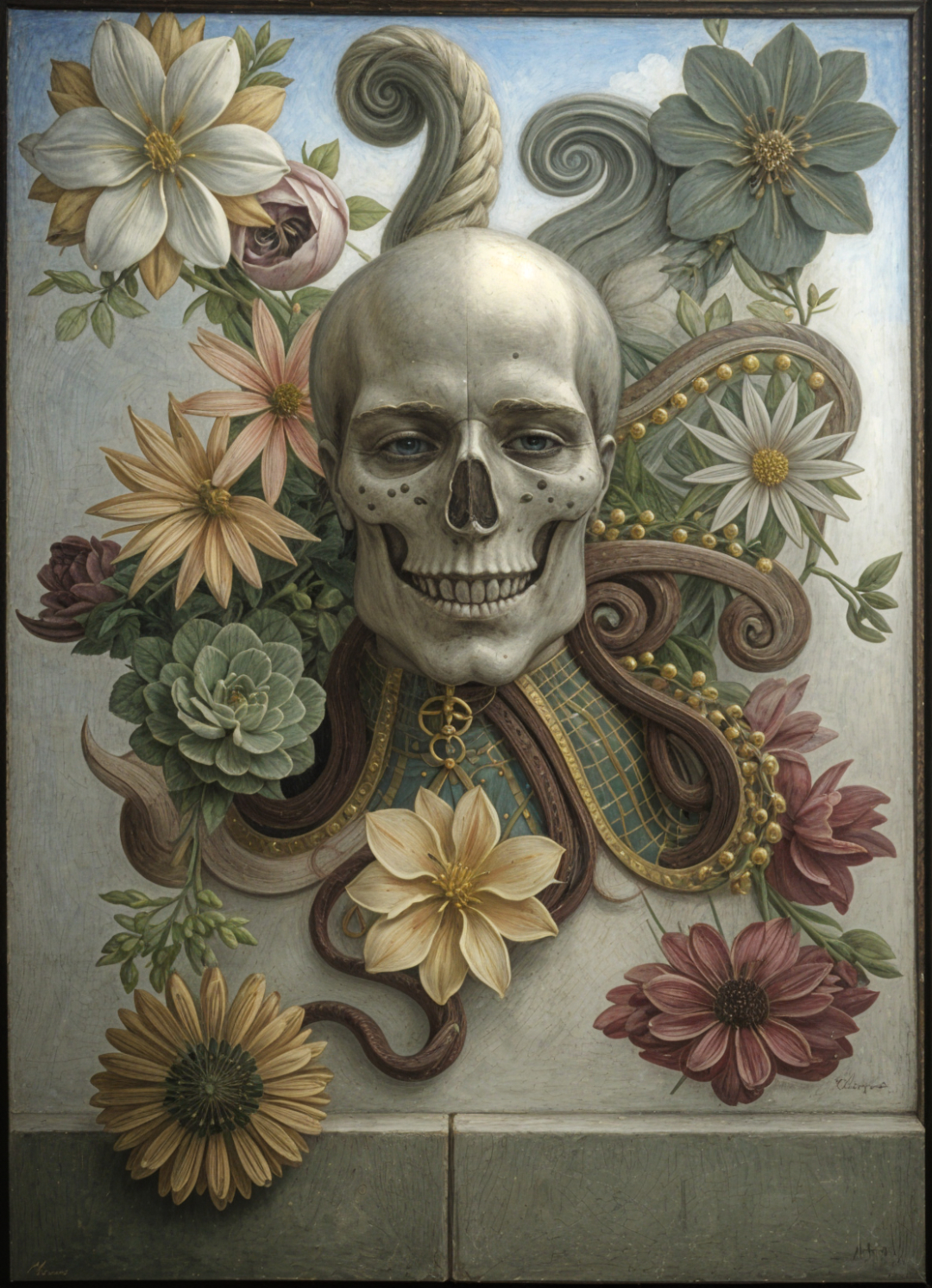 The overall composition of the image is balanced and harmonious, with the tentacles gently cradling the skull, and the flowers cascading around it like a graceful crown. The interplay of life and death, the fragility of existence against the backdrop of vibrant blossoms, invites viewers to reflect on the cyclical nature of life, the inevitability of mortality, and the profound beauty that can arise from the union of contrasting elements.