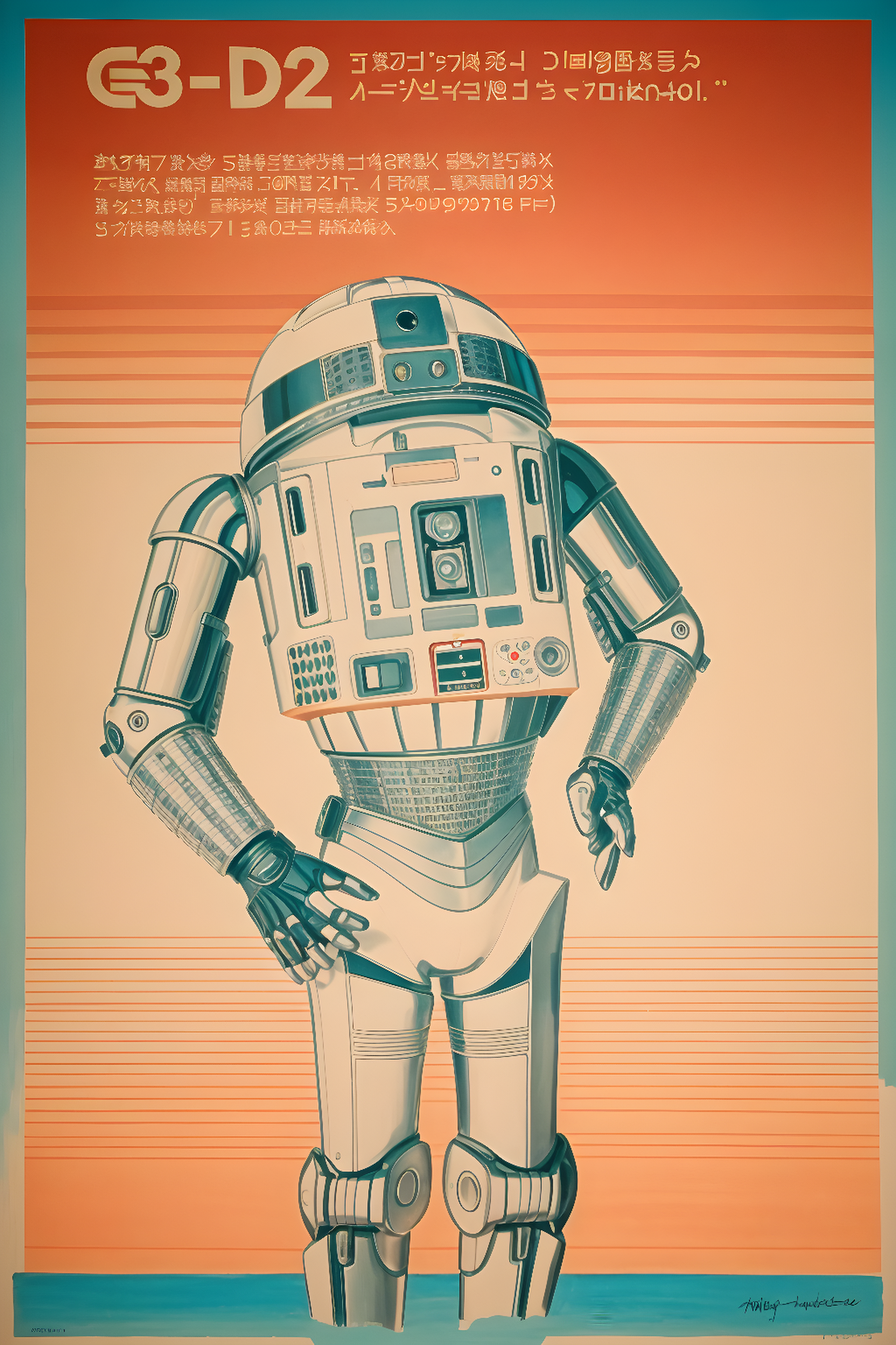 With its monochromatic palette, the illustration evokes a sense of nostalgia, reminiscent of vintage Star Wars memorabilia and the thrill of discovering rare treasures within the vast galaxy of collectibles. 'C3-D2' serves as a testament to the dedication and enthusiasm of Star Wars enthusiasts, reminding us that even in the form of an illustrated figurine, the power of imagination and fandom knows no bounds."
