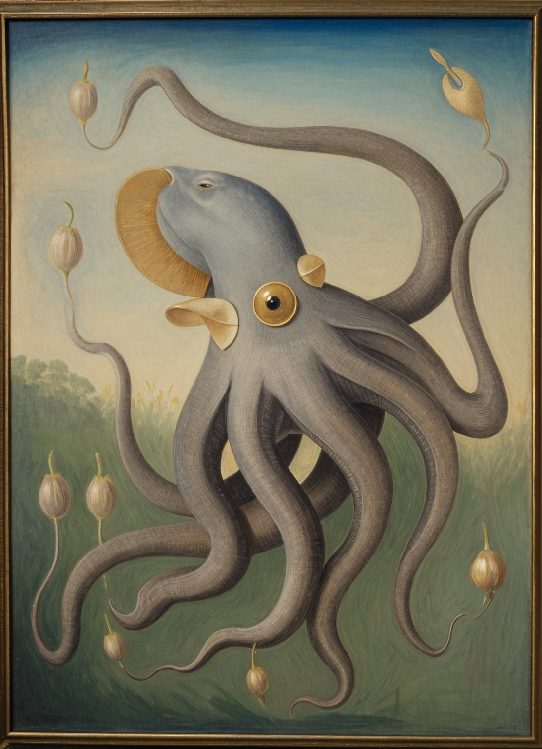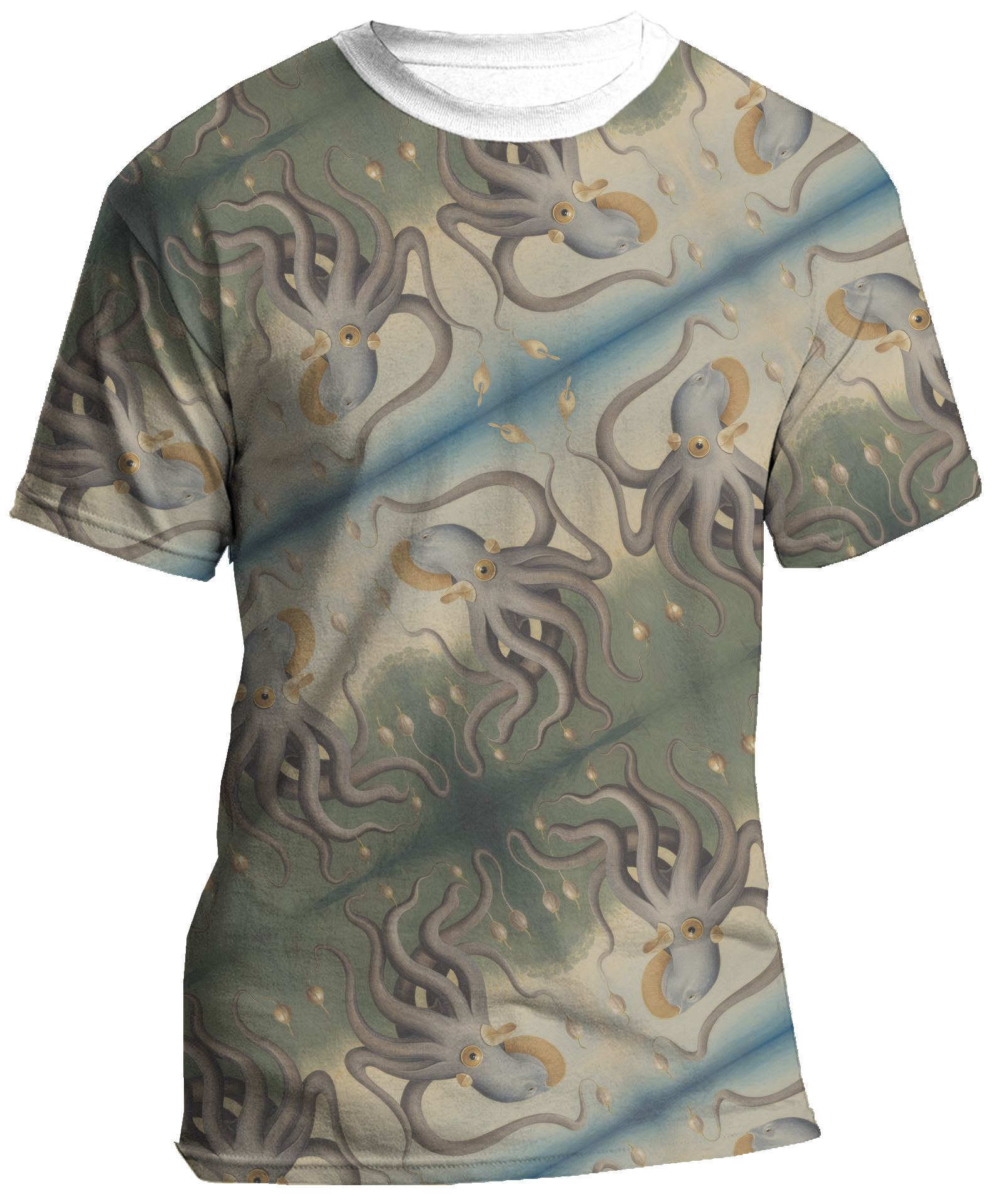 The overall composition of the image is balanced, with the octopus positioned centrally, its tentacles extending outward in an asymmetrical fashion.