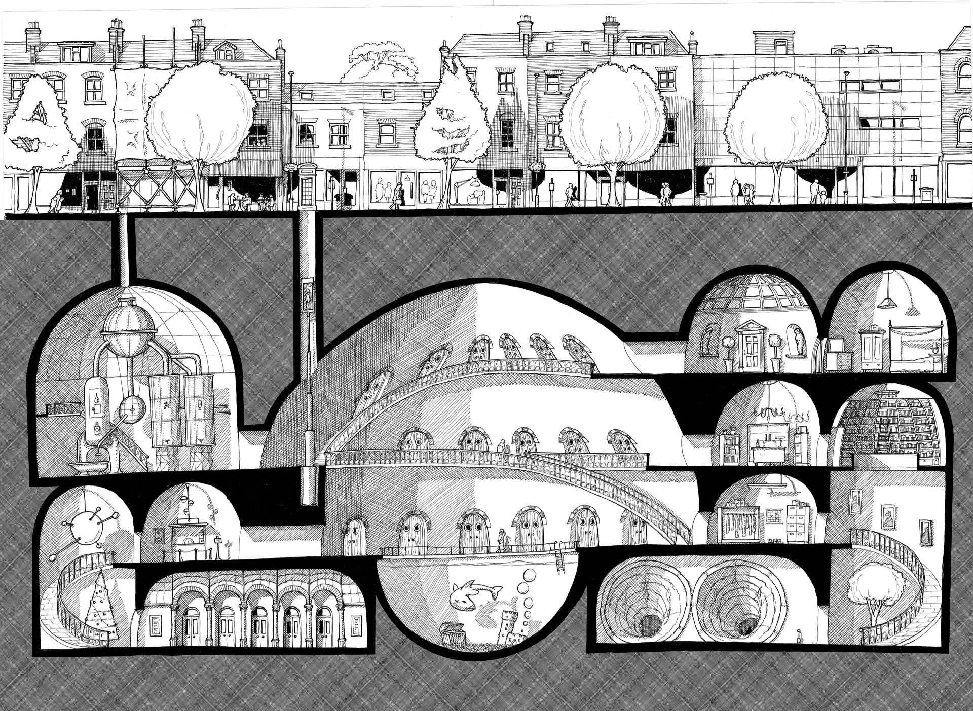 In this pen and ink drawing, a mesmerizing underground world unfolds beneath the bustling streets of Upper Street, Islington. The intricate lines and meticulous detail bring to life a vast and cavernous lair hidden deep beneath the surface, shrouded in mystery and intrigue.