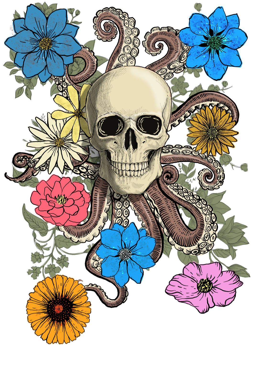 In this captivating and surreal image, the juxtaposition of life and death is explored through the depiction of a skull adorned with vibrant, colorful flowers, with elegant tentacles reaching out from behind.