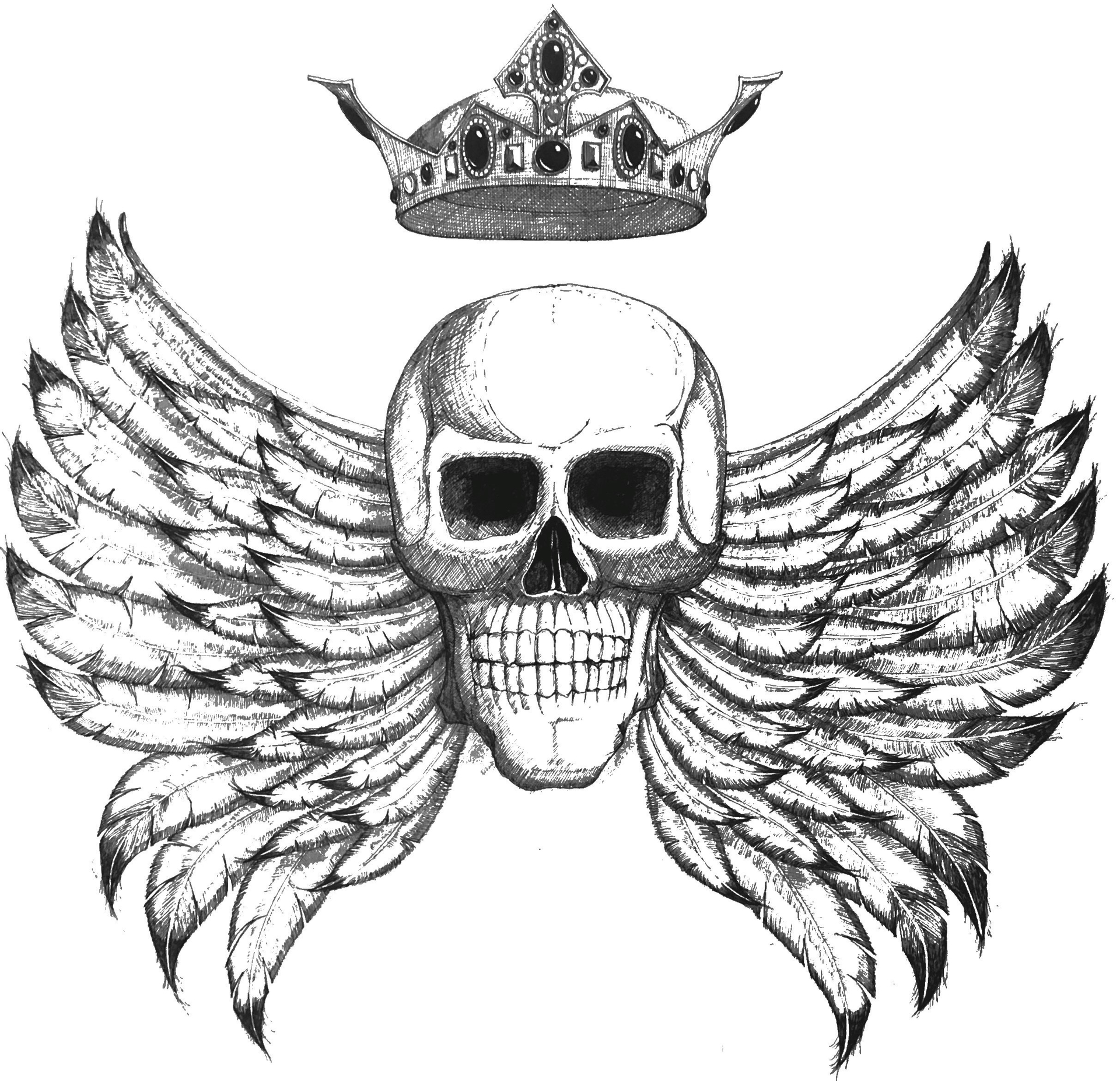At the center of the drawing, a skull takes prominence, its skeletal features rendered with meticulous detail. Despite the absence of flesh, the skull exudes an air of majesty and strength. It appears to float effortlessly, defying gravity and earthly constraints. Adorned with a crown, its significance as a regal and timeless symbol is heightened. The crown, delicately crafted with fine lines, showcases ornate details, signifying sovereignty and authority.